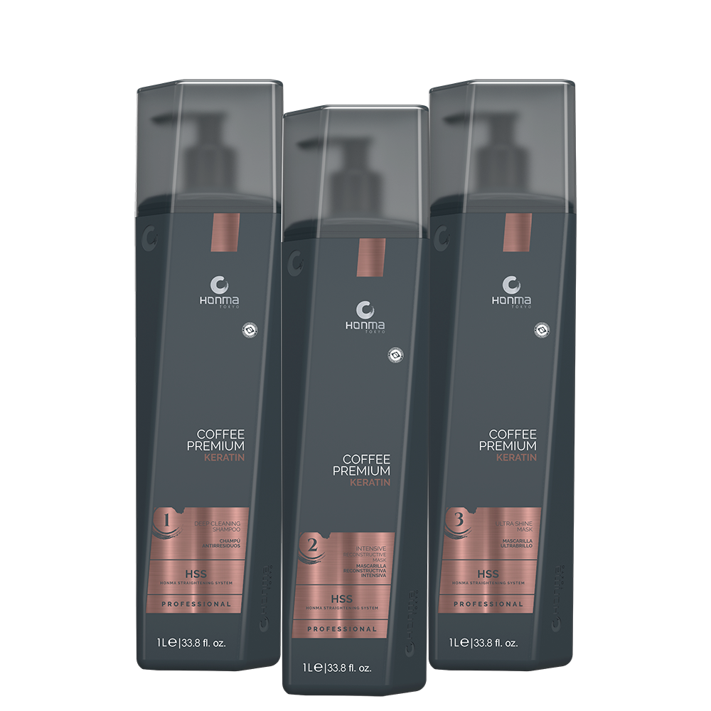 Professional Line Coffee Premium by Honma Tokyo é um sistema inovador de reconstrução capilar, rico em proteína e aminoácidos. Possui em sua fórmula uma combinação perfeita de Extrato Glicólico de Café e Bioativos Marinhos Catiônicos associados a Proteína do Trigo e a Queratina, que agem intensamente nos fios reduzindo a porosidade, proporcionando corpo e balanço e uma superfície mais uniforme e alinhada, além de cabelos hidratados e macios.
