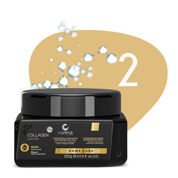 Se houver necessidade de completar o tratamento, aplique a Máscara Reparação Total Collagen Caviar em toda extensão dos fios, enluvando-os. Deixe agir de 5 a 10 minutos e enxágue bem.